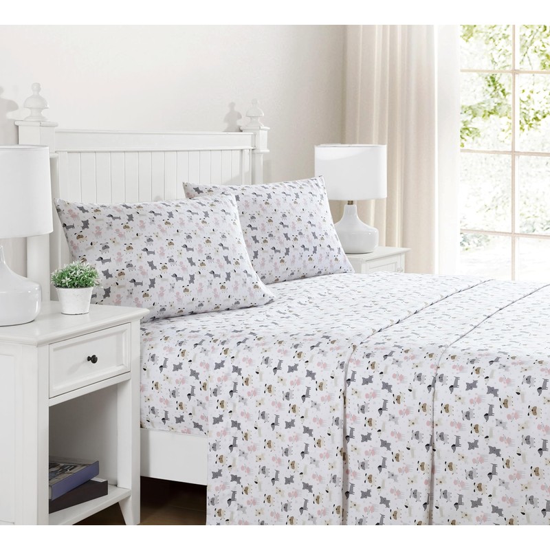 Beatrice Home Fashions Beatrice Home Fashions Printed Microfiber Sheet Set, Soft Comfortable Easy Care, Includes 1 Fitted Sheet with 12" Deep Pockets, 1 Flat Sheet, Pillowcase, King, White Puppy Love