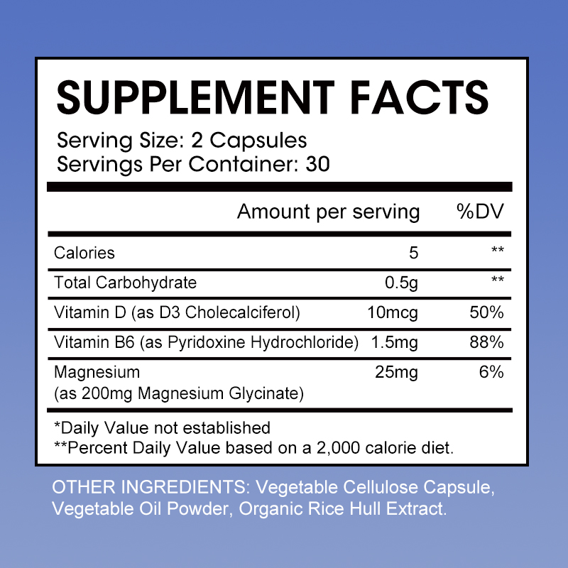 • Ingredients: Magnesium Glycinate, Vitamin D3, Vitamin B6 , Zinc