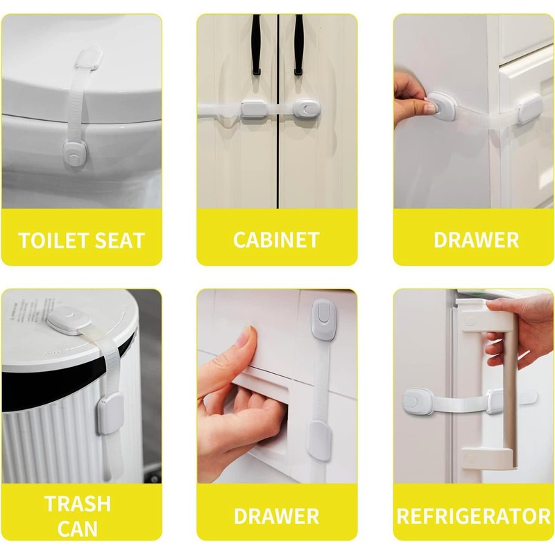 - ๐๐๐ฃ๐ฎ๐ฌ๐ญ๐๐๐ฅ๐ & ๐๐ง๐ข๐ฏ๐๐ซ๐ฌ๐๐ฅ ๐ ๐ข๐ญ: The adjustable straps range from 3โ to 7โ in length, making them suitable for a wide variety of applications. Whether it's a flat surface like drawers or an edge such as refrigerator corners, these locks adapt to fit your needs. Perfect for cabinets, closets, fridges, microwaves, washing machines, dishwashers, trash bins, and toilets.