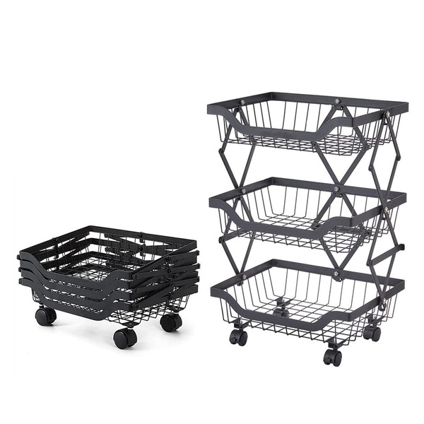 Beaugreen Metal Kitchen Storage Carts Foldable Fruit Vegetable Baskets Cart Standing Shelf Rack on Wheels for Kitchen,Home,Office,Living Room,Pantry,Snack Storage(3 Tiers)