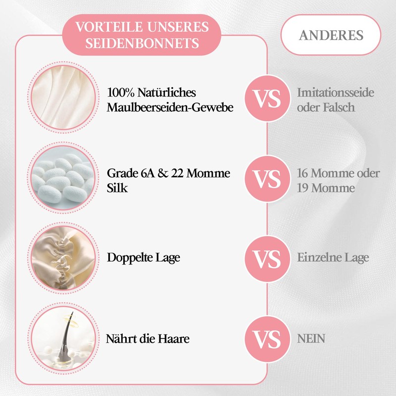 - Natural hair care: this silk cap for sleeping made of pure silk is an ideal choice to care for your hair at night. It gently protects your hair and avoids breakage, frizz and the problems with natural oils. Made from 100% mulberry silk, its delicate texture makes hair silky smooth when in contact and reduces damage. Wearing this silk bonnet at night is not only a natural way of hair care, but also a deep care for the hair.