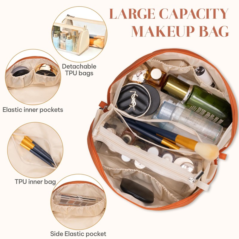 - 【Large Capacity Makeup Bag】 Our large capacity travel makeup bag features multiple compartments and a large open flat design for quick access to your items. It has two large main compartments to meet all your makeup, skincare and toiletry needs. With elastic pockets on both sides for storing small items.