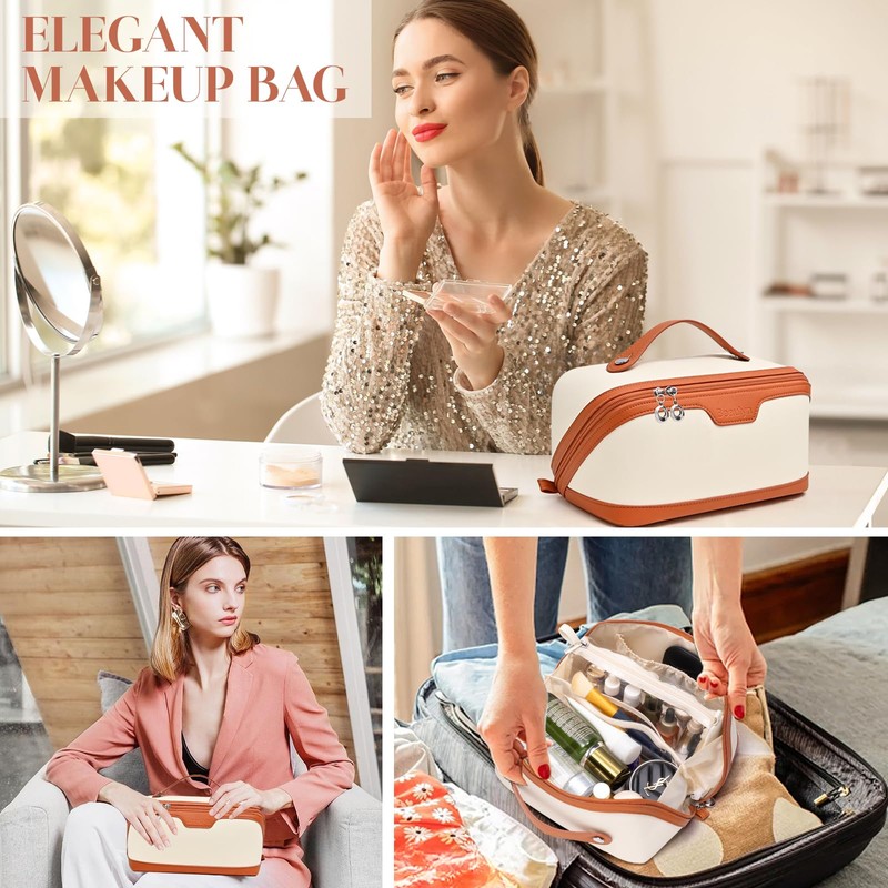 - 【High-quality Material】 Our travel makeup bag is made of high-quality waterproof and sturdy PU leather, soft, lightweight, and durable. The inner lining is made of premium twill thick lining, abrasion-resistant and not easy to tear. The cosmetic bag has a detachable PVC inner bag, resistant to dirt, easy to clean, achieving dry and wet separation. And the top with a handle, convenient for carrying.