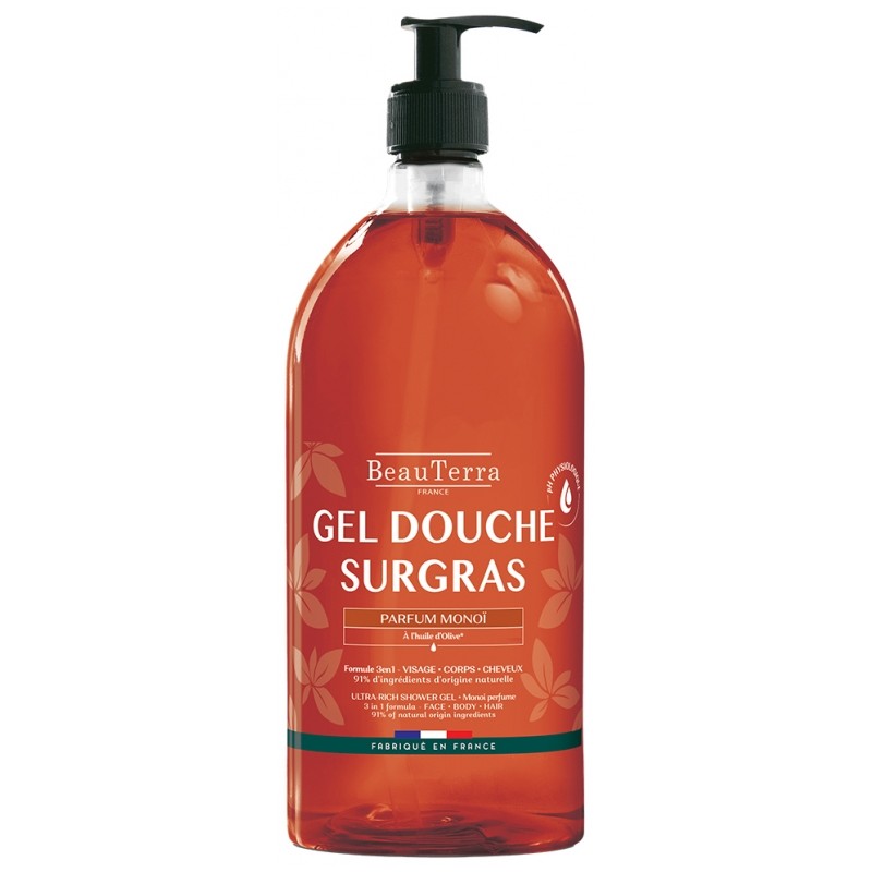 BeauTerra Monoï Surgras Shower Gel 1 L is a shower gel with a 3in1 formula: face, body and hair. Its soap-free formula, with a physiological pH for the skin, respects the balance of the cutaneous barrier.