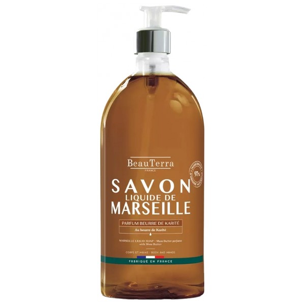 BeauTerra Shea Butter Liquid Marseille Soap 1 L is a 2in1 formula: body and hands, suitable for normal skin. Traditionally made by a Master Soapmaker using the saponification process, this soap is made only from vegetable oils.