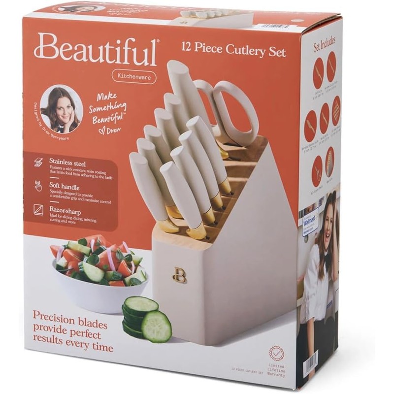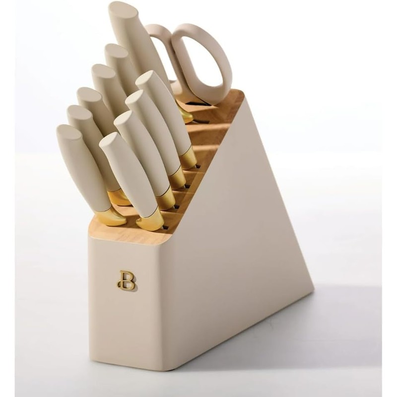 Beautiful 12-Piece Stainless Steel Knife Block Set by Drew Barrymore, Soft-Grip Ergonomic Handles, Stick-Resistant Coating (Porcini)