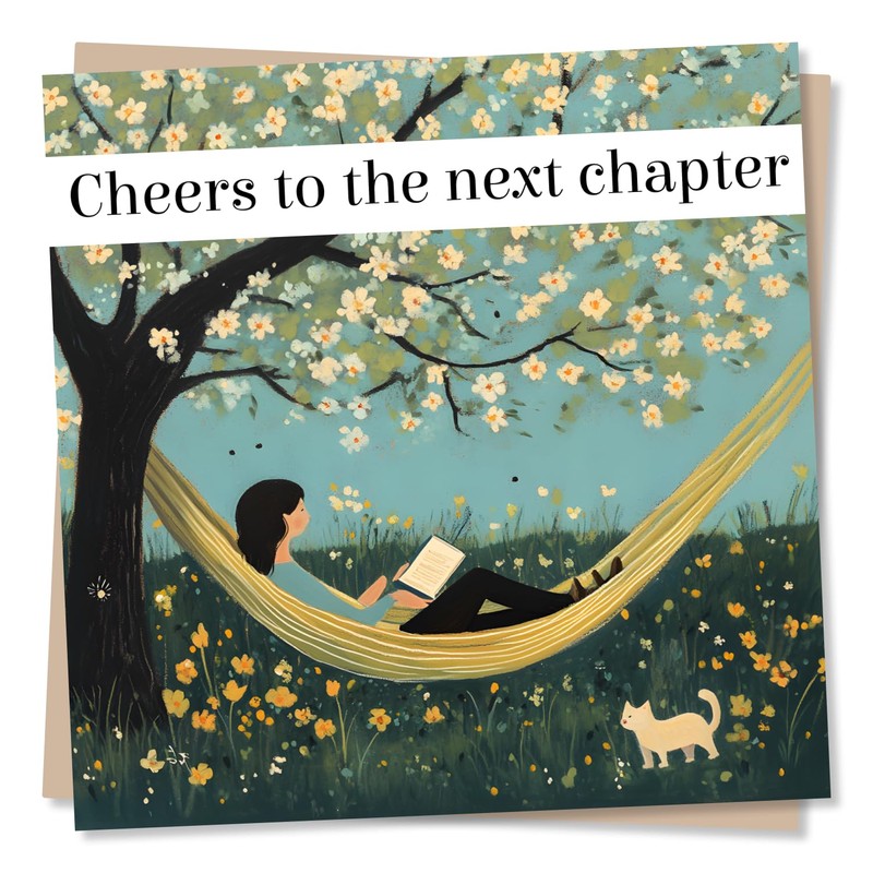 Beautiful Happy Retirement Card For Loved One - White Flowers, Cherry Blossom, Woman, Hammock, Cat, Nature - Cheers To The Next Chapter - For Mum, Nan, Aunt, Auntie, Sister