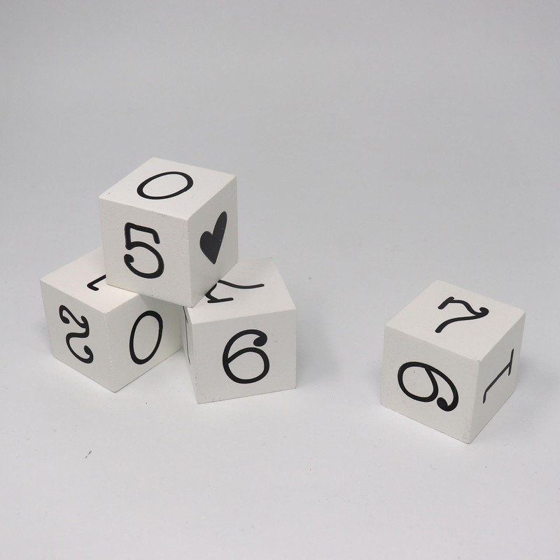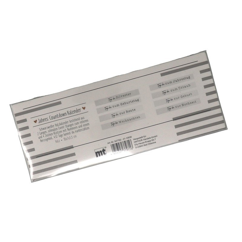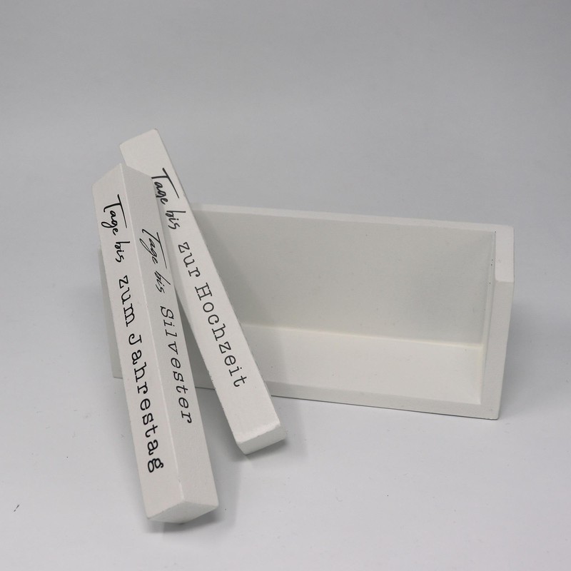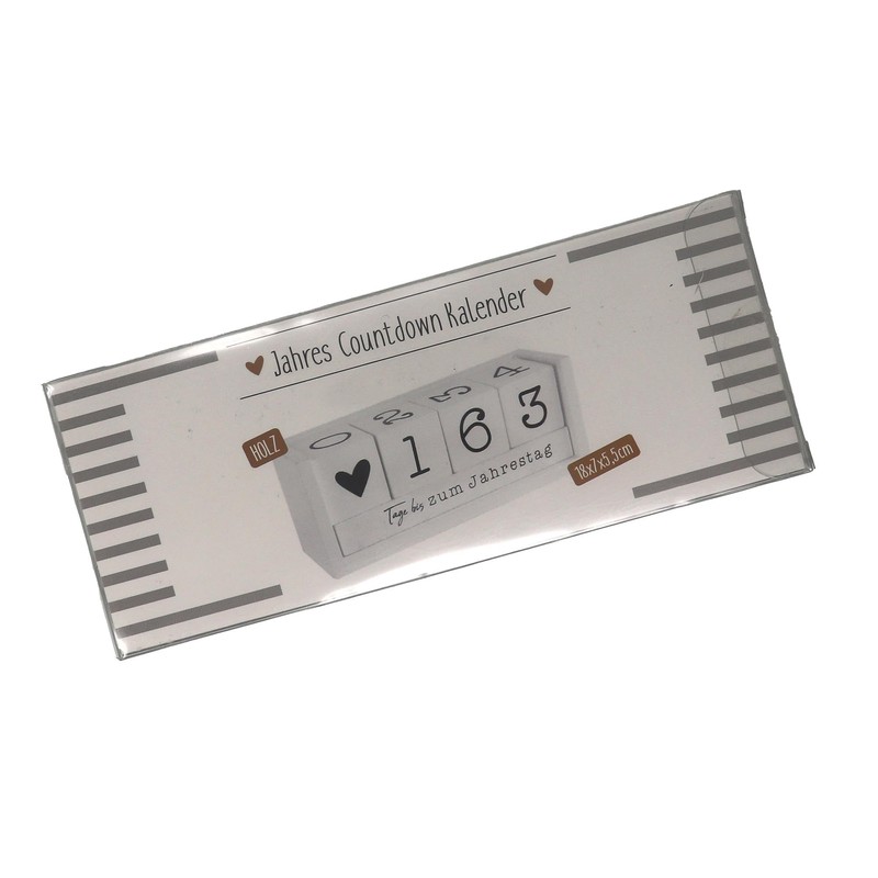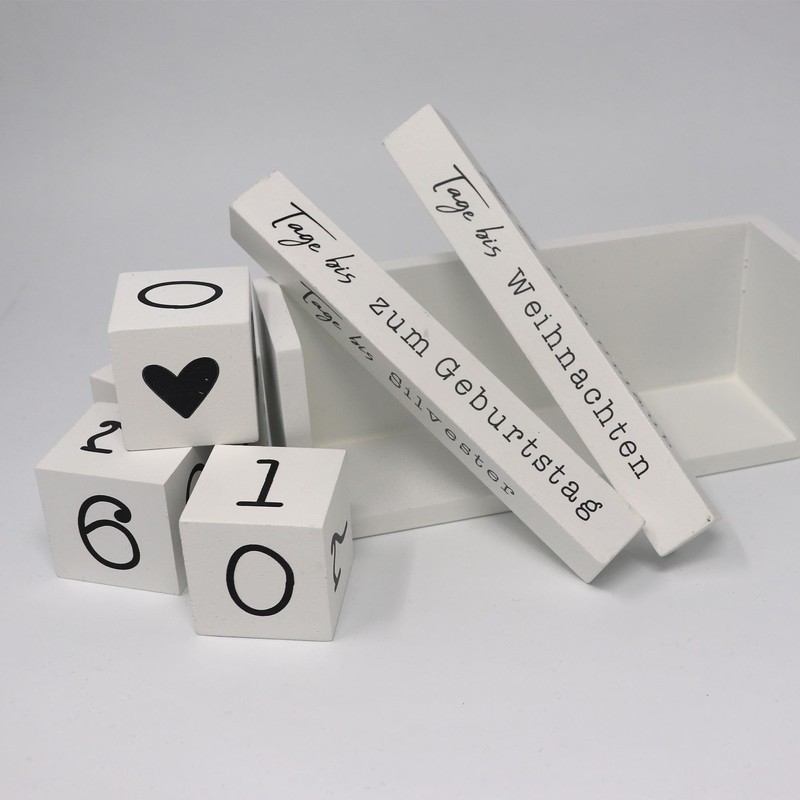 Beautiful countdown cube made of wood. Material: MDF, lacquered white with black print. 4 wooden cubes for 8 different events to count down. W: 18 cm H: 7 cm D: 5 cm. The following occasions are possible: up to the anniversary to the birthday until retirement until Christmas until New Year's Eve until the holiday to the birth to the wedding. Simply set the corresponding days in the number field. with the event in and counting down can begin...