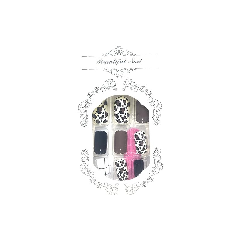 Transform your nails instantly with this stunning set of 24 press-on nails featuring an elegant mix of leopard print and solid color designs. The collection includes sophisticated black, brown, and white shades perfect for any occasion. These easy-to-apply false nails provide a professional-looking manicure in minutes, without the need for salon visits. Each nail is carefully crafted to ensure a natural appearance and comfortable fit. The set combines classic solid colors with trendy animal prints for versatile styling options. Simple to apply and remove, these press-on nails offer a quick solution for achieving a polished, fashionable look. The set includes detailed application instructions for best results. Perfect for special events, daily wear, or when you need a quick nail transformation. These false nails provide a salon-quality appearance that can last through your daily activities while protecting your natural nails underneath.