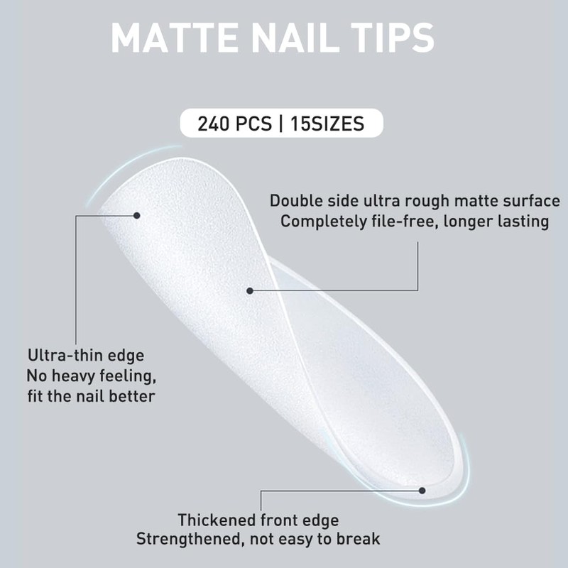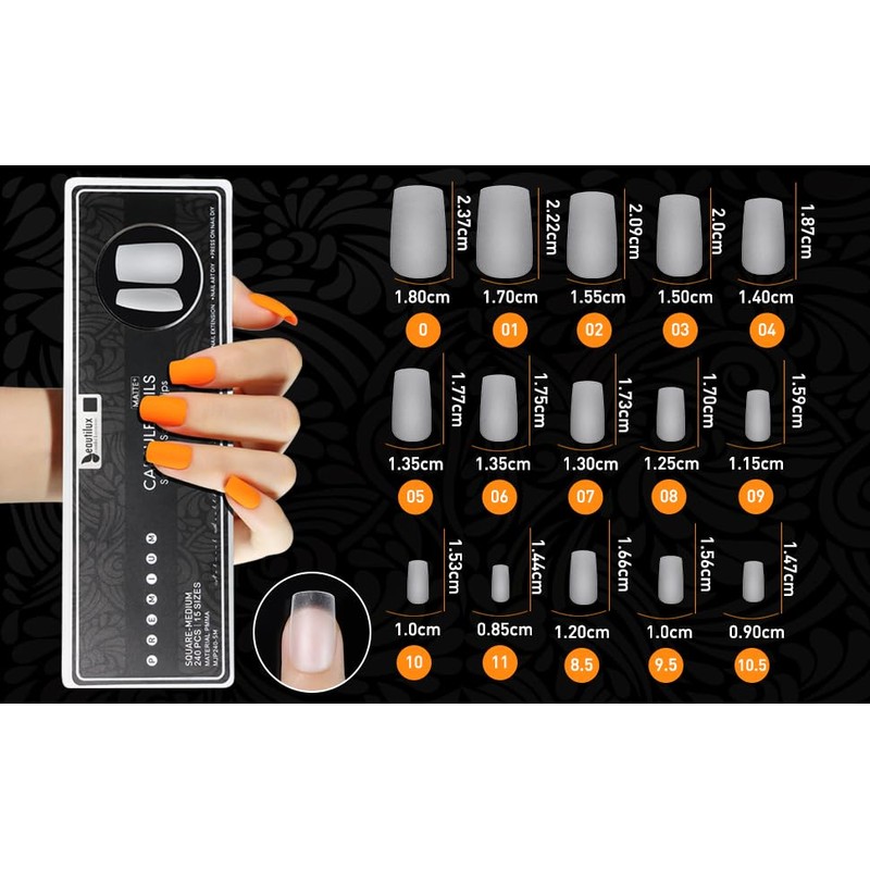 Beautilux Nageltips Quadrat, Full Cover Nail Tips, Pre-Buff Matt Transparent Square Medium für Heimmaniküre und Nagelstudios-240 Pieces 15 Sizes