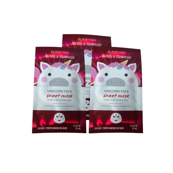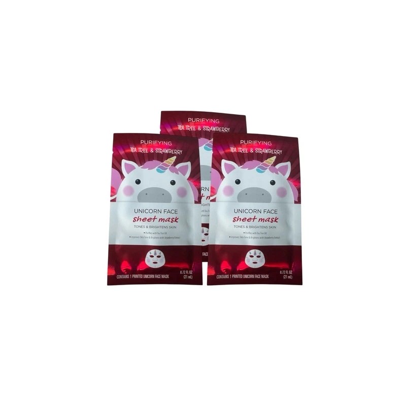 A 5 pack of adorable unicorn printed sheet masks. These masks are both cute and good for your skin. These masks are a top allergen friendly and free of Gluten, Nickel, Top Common Allergy Causing Preservatives, Lanolin, Paraben, Topical Antibiotic, MCI/MI, Dye, and SLS. Product is Teen Safe.