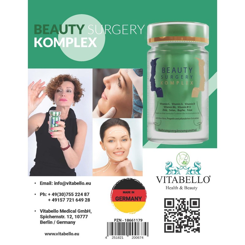 Beauty Surgery Complex is a specially developed dietary supplement with high-dose vitamin C and zinc to maintain a normal immune system after surgical procedures. A healthy lifestyle is characterised by a needs-based supply of nutrients. Especially after surgical procedures, a good immune system is important for the process of wound healing.