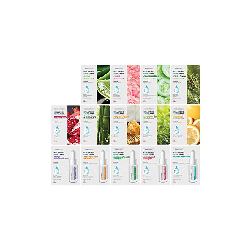 - 14 combo 2 WEEKS SUPPLY pack of Hyaluronic Aqua Plus essence sheet mask. Hydration, soothing, brightening and firming. Contains hyaluronic acid for hydration, collagen, vitamin C, ceramide, madecassoside, peptide and natural ingredients.
