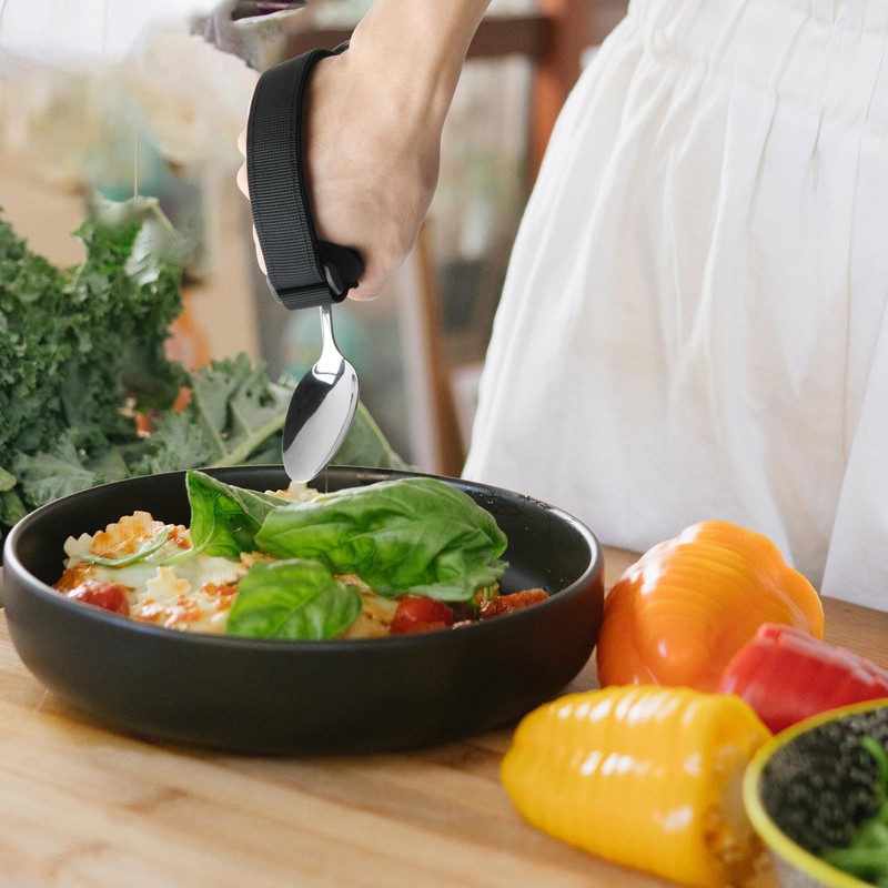 - Holds various utensils and eating cutlery such as spoons, forks, and knives to make it easier for individuals with weak or limited grasp to eat.