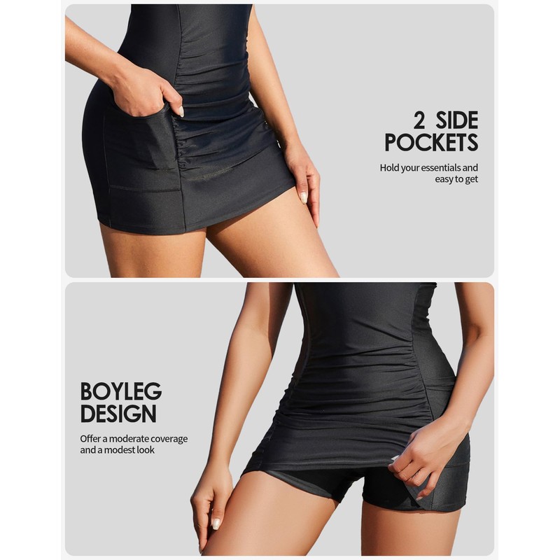 - BOYLEG WITH RUCHED: Our modest swimsuits feature skirt with ruched to covers bikini area and avoid wedges, offering a modest and slimming look that accentuates your body curves