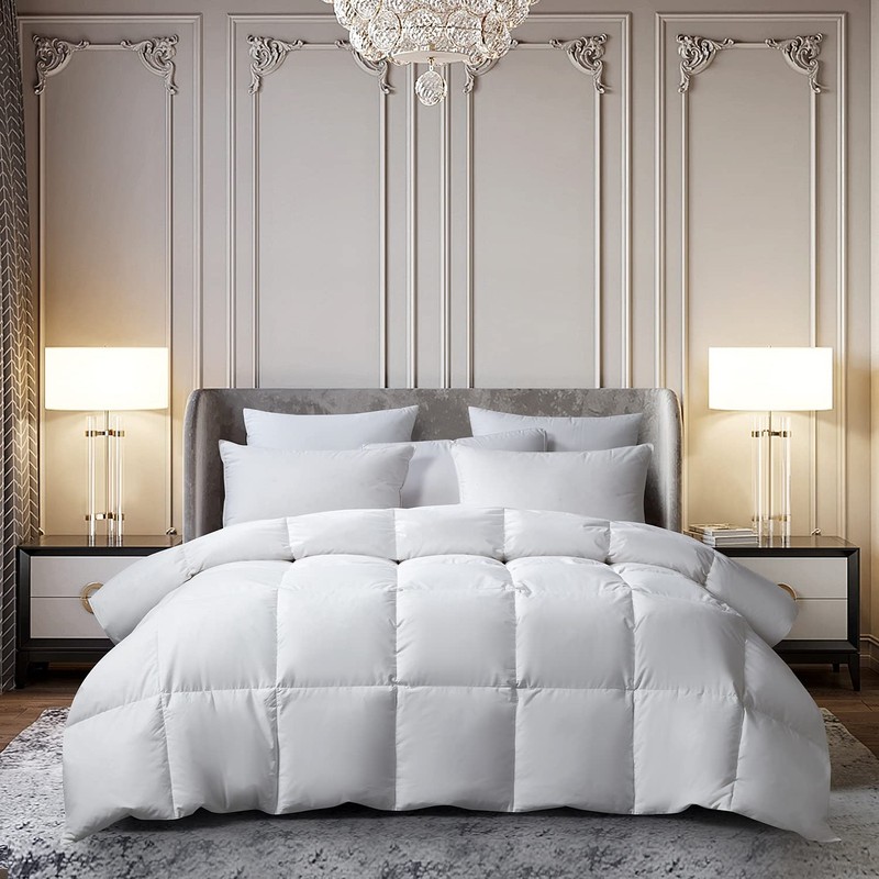 - Comfort and Fluffy - Queen comforter measures 90'' Width and 90'' Length. Filled with the right amount of sufficient feather and white down to make this comforter comfort and fluffy.