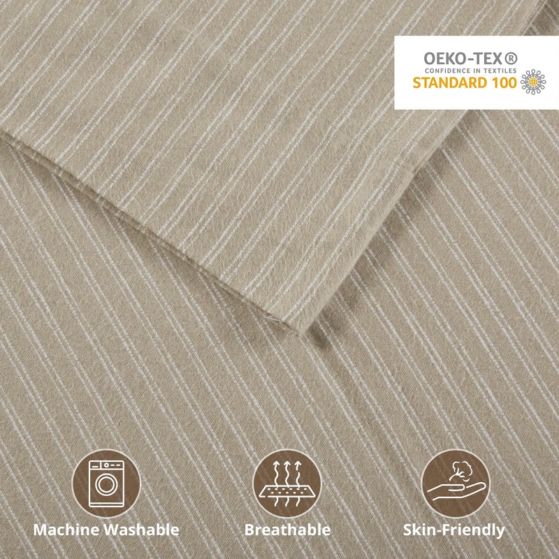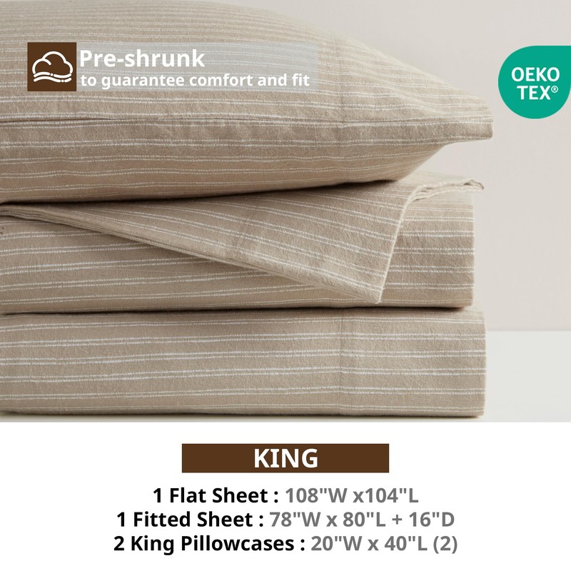 Beautyrest Cotton Sheet Set Cozy Print 100% Cotton Flannel Sheets Warm & Fuzzy Bedding Set, Oversized Sheets, Deep Pocket Fits Up to 16" Mattress King Bed Sheets King Beige/White Stripes 4 Piece