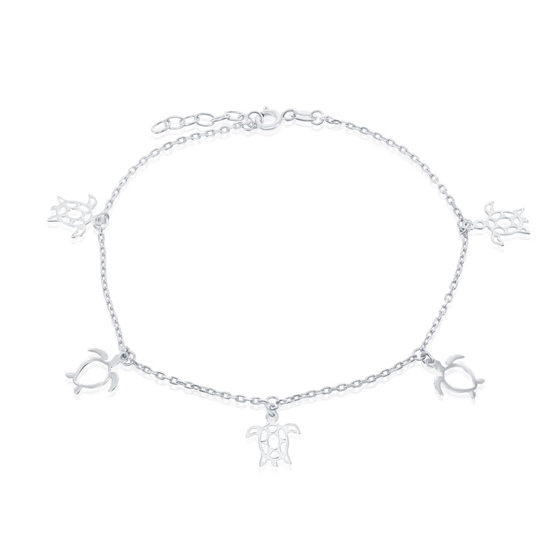 - Add a cute touch to your attire with this Sterling Silver High Polish Cut-Out Sea Turtle 9+1’’ Anklet! This marine inspired anklet contains three 13mm sea turtles that have a shell design on it as well as the small detail of its tail hanging on the bottom like a realistic sea turtle. It also has two 13mm sea turtle that just contain the outline of the marine animal. The mix of these two designs really makes it stand out and with the silver tone color will add a cute touch to your everyday attire