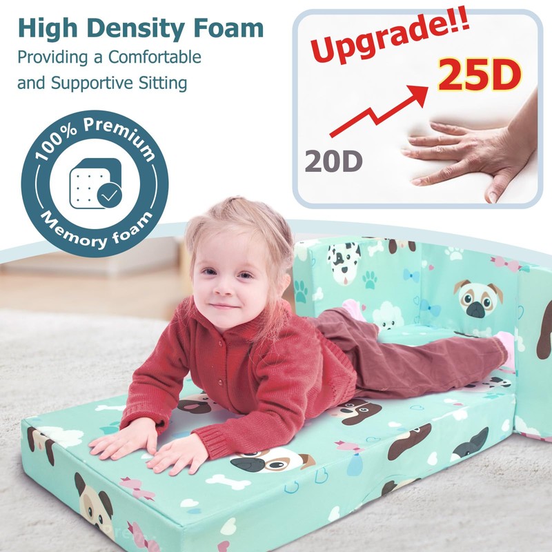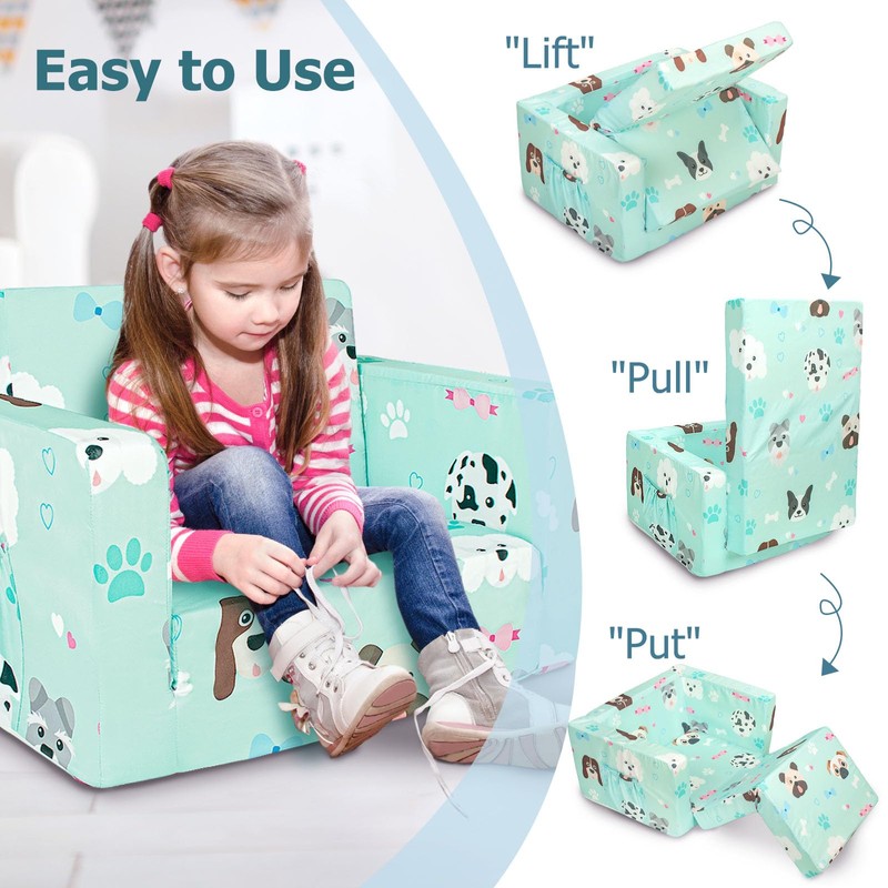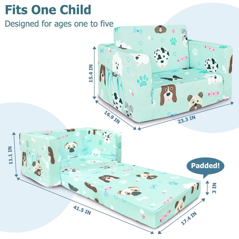 Beavtaens 2-in-1 Kids Fold Out Couch, Convertible Sofa to Lounger for Girls and Boys, Soft Toddler Chairs Comfy 1-3 Years Old (Green Dog)