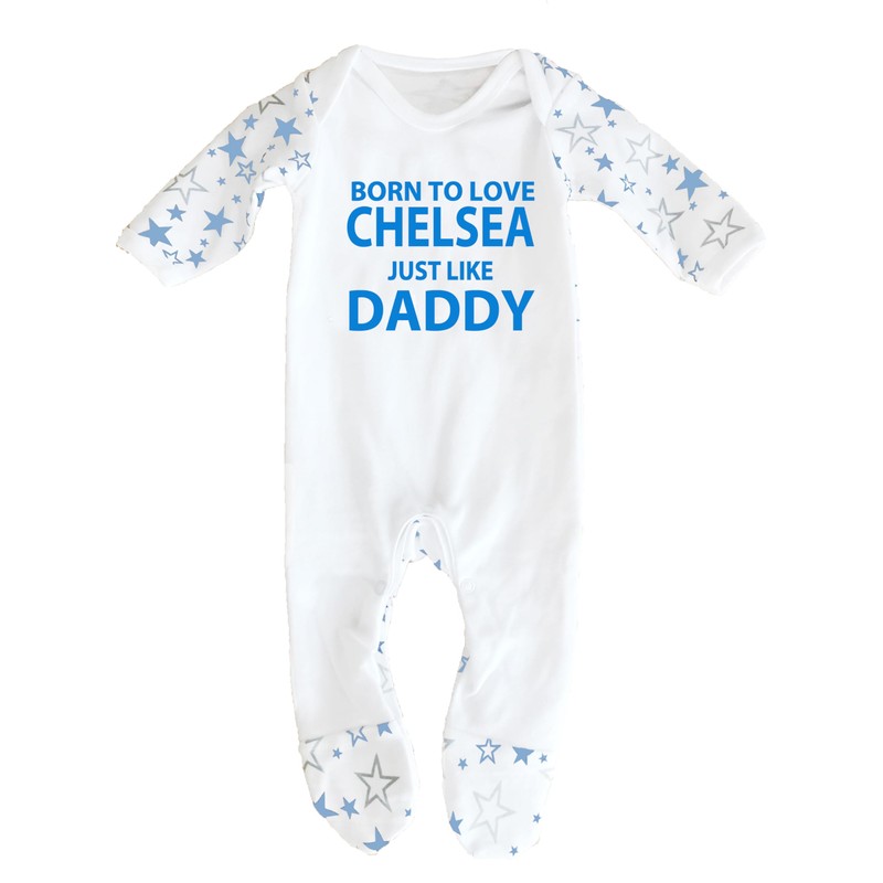 Bebe Dory Born To Love Chelsea Just Like Daddy - Soft 100% Combed Cotton Football-Themed Baby Sleepsuit for Football Fans (UK, Age, 0 Months, 3 Months, White/Blue Stars)