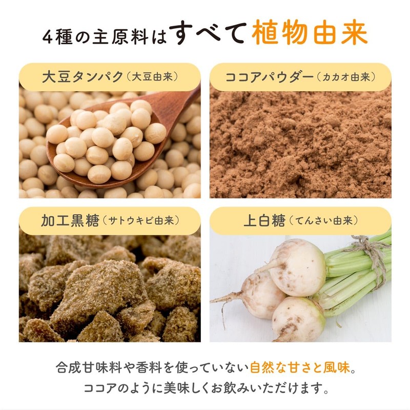 - 原材料名:大豆たんぱく(国内製造)(遺伝子組換えでない)、加工黒糖、ココアパウダー、上白糖(北海道産てんさい)/卵殻カルシウム、酸化マグネシウム、V.C、ピロリン酸第二鉄、抽出V.E、ナイアシン、パントテン酸Ca、V.B1、V.B6、V.B2、V.A、葉酸、V.D、V.B12(一部に卵・大豆を含む) 賞味期限:製造から6か月
