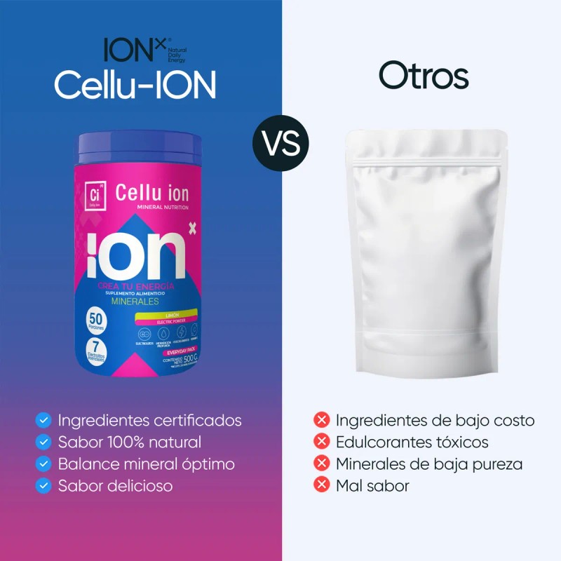 - 50 porciones | ION X | Cellu Ion CONTENIDO Frasco de 50 porciones de 10 g para 400 ml de agua cada una. Para 60 días recomendados de tratamiento mineral 3 tomas diarias se requieren 4 frascos NUTRICIÓN CELULAR Mejora la salud celular y fortalece tejidos con nuestro tratamiento mineral hidratante de uso diario, enriquecido con vitamina C. PIEL SANA E HIDRATADA Desde las primeras semanas de consumo notarás beneficios en tu energía, concentración, digestión e incluso estado de ánimo. Los cambios en la piel tardan más tiempo puesto que son reflejo resultante de lo que sucede en el interior de tu cuerpo. Al menos sugerimos 60 días de consumo ininterrumpido para obtener cambios notorios en la piel. ORGÁNICO Y PURO Ingredientes orgánicos certificados Kosher, USDA Organic y Bio gri, cafeína, colorantes o conservadores artificiales. USO DIARIO IDEAL Con 50 porciones por frasco, Cellu ion es tu compañero diario para una hidratación óptima y una mejora en la nutrición celular. SABOR REFRESCANTE Disfruta del sabor natural de limón y miel de abeja orgánica, perfecto para hidratarte de manera deliciosa y saludable. VIDA ACTIVA Ideal para el gym o día a día, IONX es el compañero perfecto para mantenerte hidratado y energizado sin comprometer tu dieta. BENEFICIOS + Hidratación profunda de la piel y tejidos. + Reduce la inflamación celular. + Fortalece el cabello y uñas. + Retrasa el envejecimiento celular. ESTE PRODUCTO NO ES UN MEDICAMENTO, SU CONSUMO ES RESPONSABILIDAD DE QUIEN LO CONSUME Y DE QUIEN LO USA. SI ESTÁ EMBARAZADA O EN LA LACTANCIA CONSULTE A SU MÉDICO ANTES DE CONSUMIR ESTE PRODUCTO. Nuestros productos son libres de Cafeína, Colorantes, Conservadores artificiales, Soya y Lácteos. Utilizamos ingredientes con certificaciones cómo: Kosher, USDA Organic y Bio gricert. Libres de GMO. ION X Cellu ion representa la vanguardia en bebidas isotónicas en polvo, diseñada específicamente para aquellos que buscan no solo hidratarse sino también mejorar su nutrición celular y fortalecer los tejidos de la piel desde dentro. Cellu ion es el complemento perfecto para tu estilo de vida dinámico y saludable. Con un enfoque holístico en la salud y el bienestar, nuestra fórmula exclusiva combina minerales esenciales y vitamina C alcalina con ingredientes orgánicos certificados para ofrecerte una bebida de alta calidad y efectividad probada. Cada ingrediente ha sido seleccionado cuidadosamente para asegurar una óptima absorción y beneficios máximos. Desde la sal marina kosher y la cúrcuma orgánica hasta el jugo y aceite de limón kosher, cada componente trabaja en sinergia para hidratar, nutrir y revitalizar tu cuerpo a nivel celular. Libre de cafeína, colorantes y conservadores artificiales, Cellu ion es la elección perfecta para quienes buscan mantener un estilo de vida saludable y activo. Su delicioso sabor a limón y miel de abeja hace que cada sorbo sea un placer, recomendado para disfrutar ligeramente frío como una refrescante y nutritiva bebida diaria. Con 50 porciones por frasco, ION X Cellu ion es conveniente y eficaz, diseñado para adaptarse a tu rutina diaria y apoyar tus objetivos de bienestar a largo plazo. Ya sea como parte de tu régimen de hidratación diario o como un impulso nutritivo post