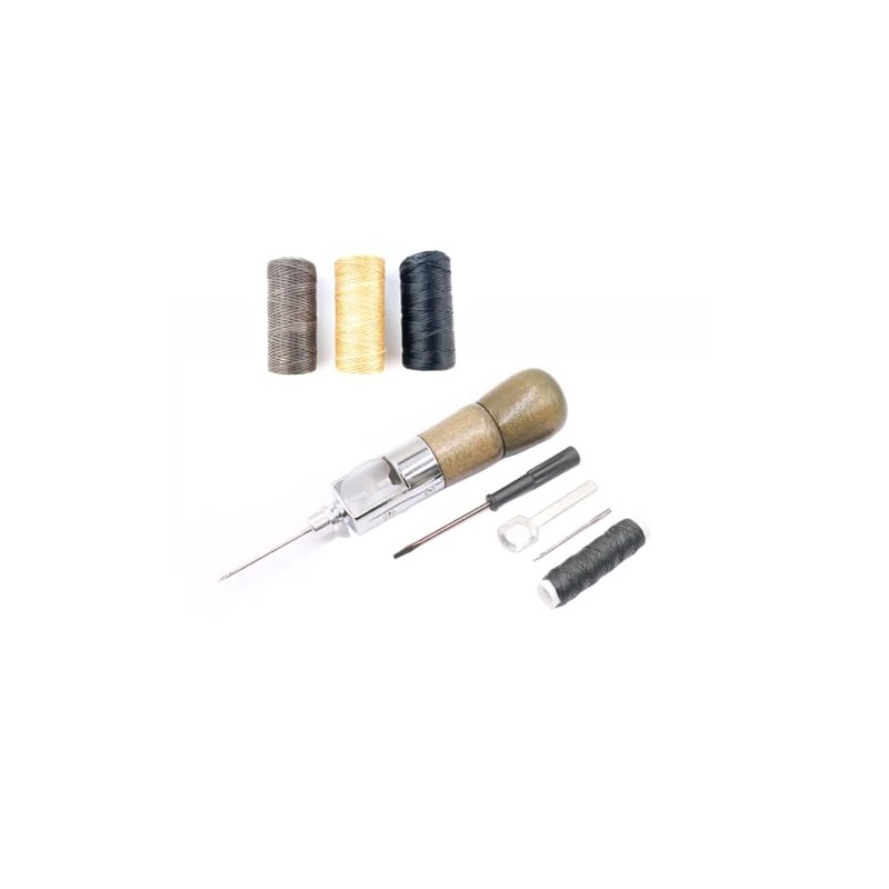 3. Single awl contains a sewing awl, with 3 R waxed thread (approx. 150 m), 2 custom diamond tip needles (1 straight and 1 curved needle #8) and instructions (possibly not in English).