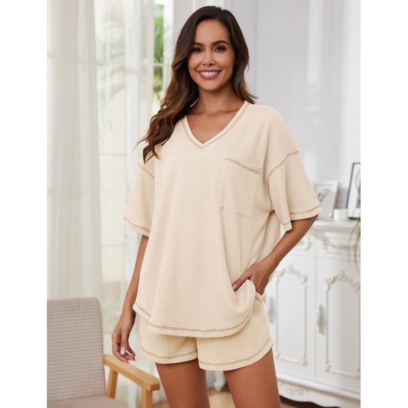 - Tops and Short: Waffle knit short sleeve pullover tops matching elasticated drawstring waist shorts, pair this 2 peice lounge set with sneaker and minimal accessories for a casual yet stylish look, you can also wear them as separates with other pieces in your wardrobe