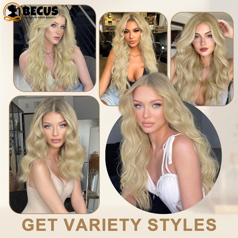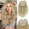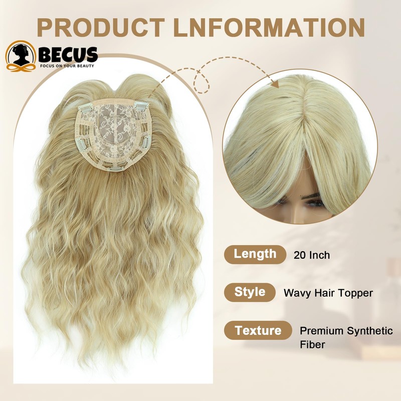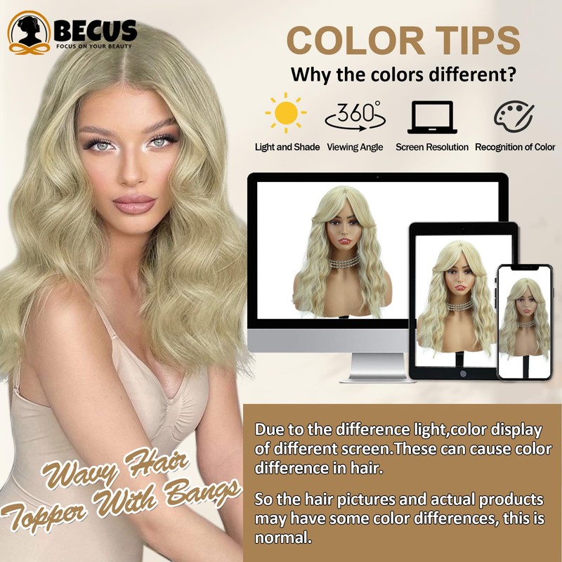 BECUS Blonde Hair Toppers for Women with Thinning 20 Inch Long Wavy Curly Synthetic 360° 3D Realistic Topper with Bangs Hair Pieces Fluffy Wispy Clip in Bangs