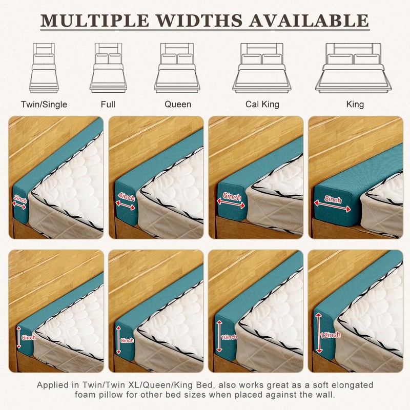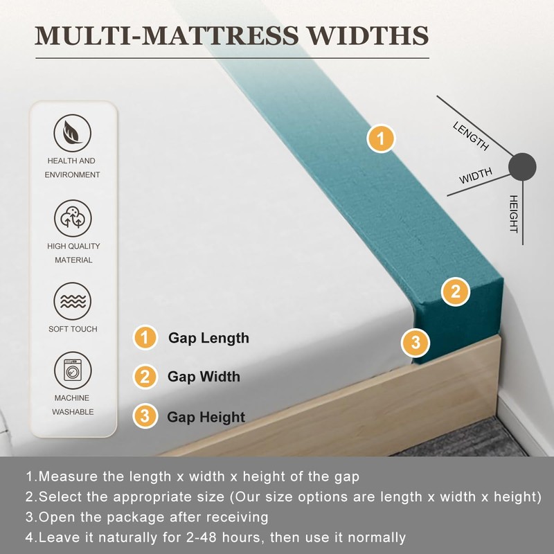 - [MULTI-MATTRESS WIDTHS] 39", 54", 60", 72", 76" applied in Twin/Twin XL/Full/Queen/Cal King/King Bed, also works great as a soft elongated foam pillow for other bed sizes when placed against the wall. You could also customize bed gap filler for crib beds. Product Size Error:±0.2in.