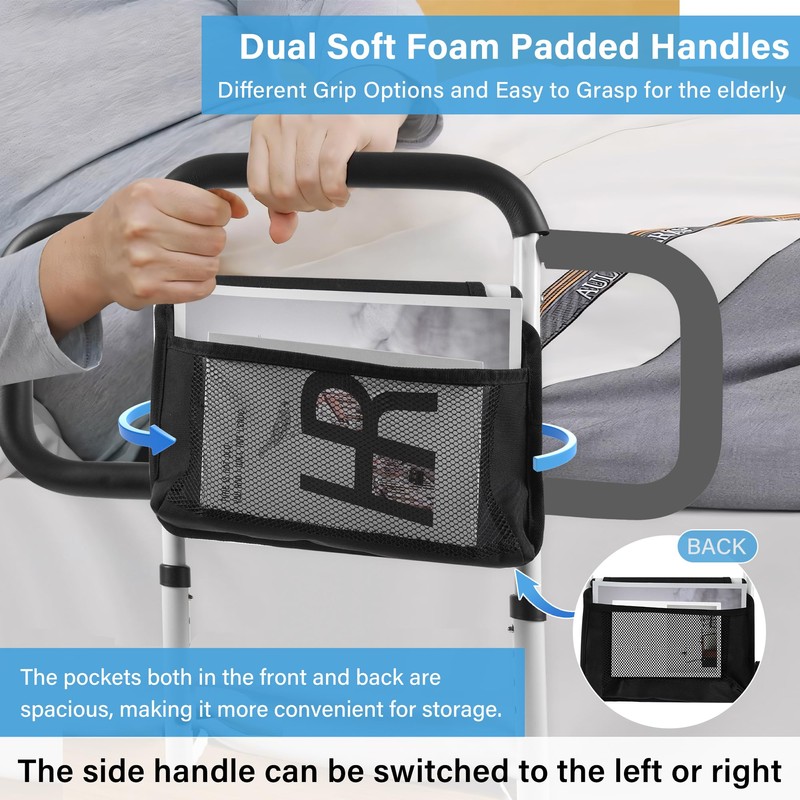 - 【ROTATABLE HANDEL & FLAT DESIGN】 Rotate the upper handle left or right, and the side handle will be placed on the left or right as you need. The handle of the bed cane comes with padded grips and is comfortable to be held by users. The flattening bottom steel pipe design makes it fit the mattress better.