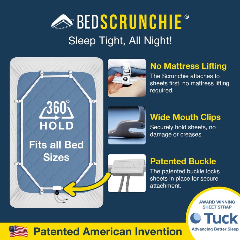 - Sleep Better with Secure Bedding - Studies show one lost hour of sleep can decrease daytime alertness by up to 25 percent. Our fitted sheet extender eliminates the annoyance of loose sheets. Suitable for various bed types, including home beds, hospital beds, RVs, and more. Sleep tight with Bed Scrunchie!