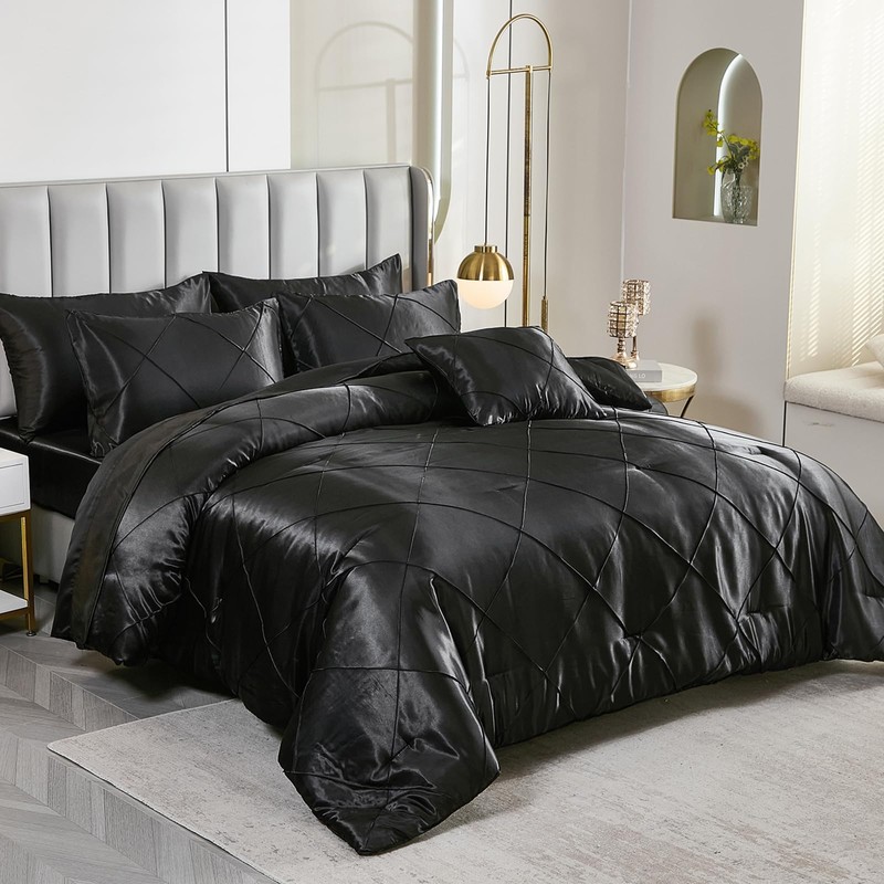 Bedbay Satin Comforter Set,Black King Size Comforter Set with Sheets,8 Pcs Geometric Pleat Bed Set,Silky Smooth Soft Bedding Set with Comforter,Flat Sheet,Fitted Sheet,Pillowcases,Cushion Cover
