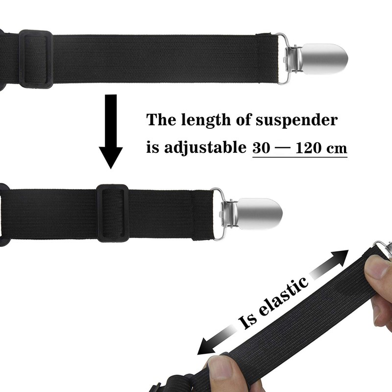 - Adjustable: from 30 cm to 120 cm. Our sheet straps come with suspenders clips at each end that securely fasten to the flat sheet and are fully adjustable for any bed and sheet size.