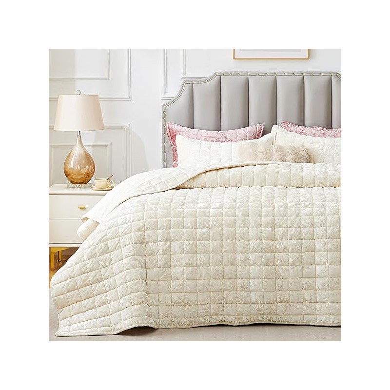 BEDELITE Velvet Quilt Set King Size - Lightweight Luxury Quilted Bedding Set,Soft Cozy Cream White Comforter Set,3 Pieces Oversized Bedspread Coverlet for All Seasons with 2 Pillow Shams