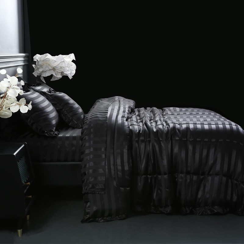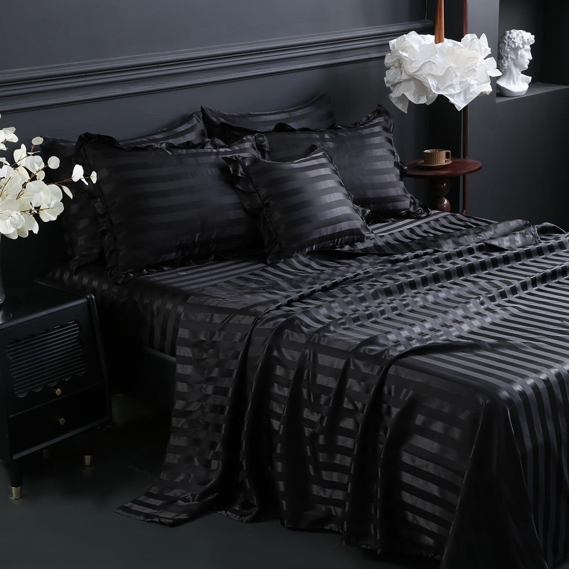 Bedorm Black Stripe Comforter Set 6 Pcs Satin Queen Comforter Black Lace Ruffle Bedding Silk Like Silky Comforter Sets with Sheets Soft Cozy Satin Bed in A Bag