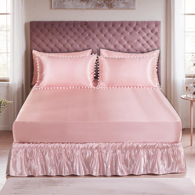 Bedorm Pink Satin Comforter Sets with Sheets White Pom Pom Bedding Set 10 Pcs Super Soft Smooth Silk Like Silky Comforter Queen Bed in A Bag with Comforter & Sheet Set & Pillowcase & Bed Skirt