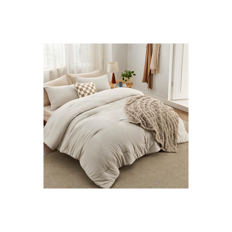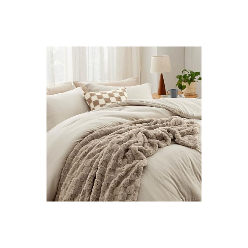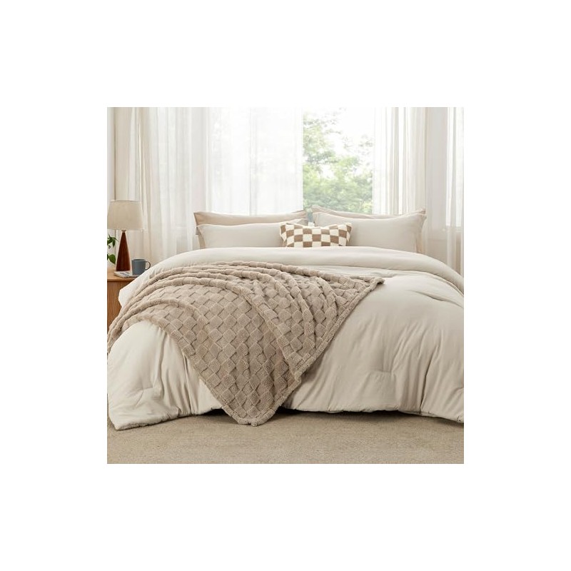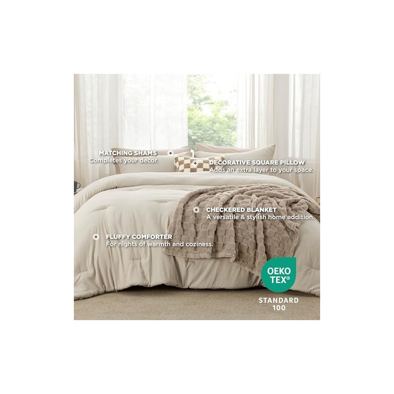 Bedsure Bedsure Queen Comforter Set 5 Pieces - Bed in a Bag with Checkered Throw Blanket and Decorative Pillow, Lightweight Bedding Comforter Sets, All Season Boho Bedding, Linen Beige