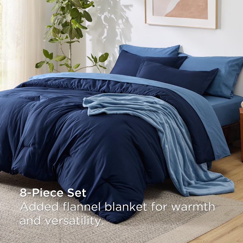 - What You Get: This king bed-in-a-bag includes 1 comforter (104" x 90"), 1 flat sheet (108" x 102"), 1 fitted sheet (78" x 80" + 14"), 2 pillowcases (20" x 40"), 2 pillow shams (20" x 36" + 2"), and 1 flannel blanket (60" x 50"). All you need to create a cozy, luxurious bed with layer of comfort.
