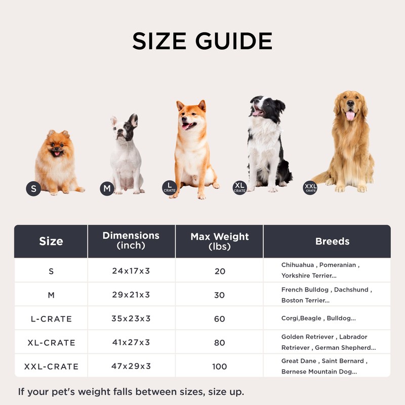 - Various Sizes: Available in 5 sizes for all dog breeds. Size S: 24x17x3 inch up to 20lbs. Size M: 29x21x3 inch up to 30 lbs. Size L-Crate: 35x23x3 inch up to 60 lbs. Size XL-Crate: 41x27x3 inch up to 80 lbs. Size XXL-Crate:47x29x3 inch up to 100 lbs. At Bedsure, our designers make sure that every pet enjoys the cozy vibes no matter their size or age. Ideal for pet owners seeking a crate pad, kennel mat, or a standalone pet bed.