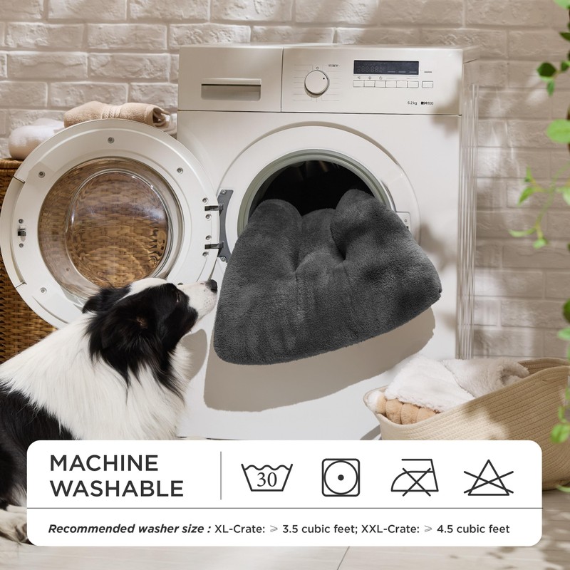 - Machine Washable: Our washable dog mat not only provides the cozy experience but is also effortless when it comes to maintenance. Simply machine wash in cold water and dry at a low temperature for consistent freshness at every use. (Care Instructions: For best results, please use a washing machine larger than 3.5 cu. ft. for XL Crate and 4.5 cu. ft. for XXL Crate.)