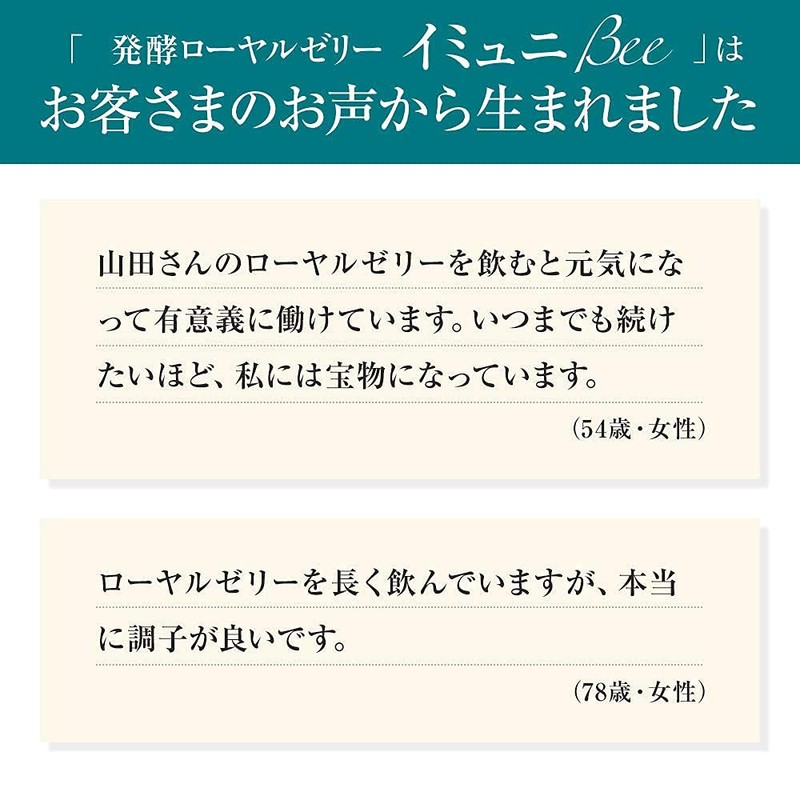 - 💡[嬉しいお声をいただきました] 「毎日元気に過ごせています」「飲んでみて、調子がいいのが自分の身体でわかりました」「ゆらぎがちな時期でも調子がいいです。続けたいです」など、多くのお声をいただいております。ぜひ一度、 『 発酵ローヤルゼリー イミュニBee 』をお試しいただき、負けない身体づくりを始めましょう。 ※個人の感想です。