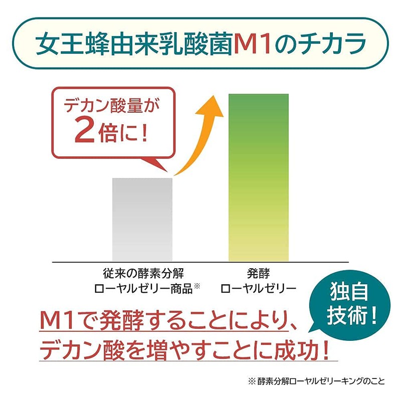 - 💡[独自技術で デカン酸 の量が2倍に!] 当社は、希少成分「 デカン酸 」を増やすための研究を行い、その結果女王蜂由来の乳酸菌「M1」で発酵させることにより、「 デカン酸 」を従来の酵素分解 ローヤルゼリー 商品※と比較して2倍に高めることに成功しました。 ※ 酵素分解 ローヤルゼリー キング