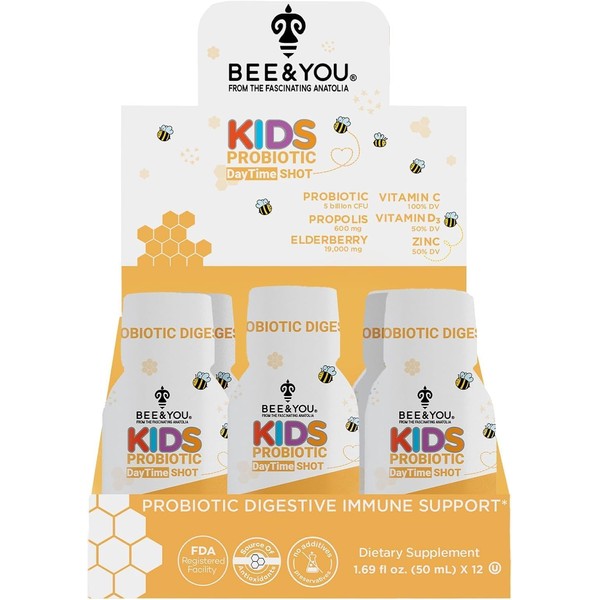Bee and You Kids Propolis Immune Day Time Shot - Probiotic, Vitamin C, Vitamin D3, Zinc, Immune Support, Gut Health, Digestive Health, 1.69 Fl. oz, 12 Pack