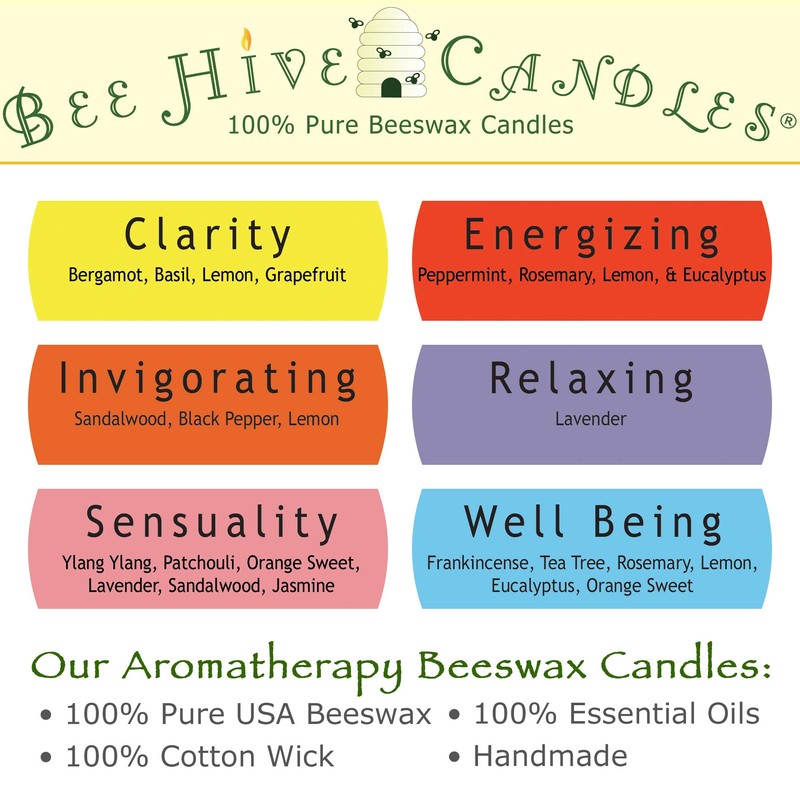 About Our Aromatherapy Beeswax Pillar Candles - Our aromatherapy beeswax candles are crafted using ultra clean beeswax which is then infused with an expertly formulated blend of pure essential oils. No fragrances, artificial scents, or fillers added. 100% USA pure beeswax. 100% pure essential oils. Lead-free 100% cotton wick.
