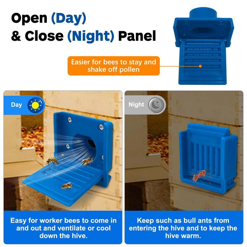 - Open and Close Panel Design: Our hive door is designed with a snap panel for controlling the hive door on and off. During the daytime, open the panel to make it easy for worker bees to come in and out to collect honey, and also to ventilate and cool down the hive. At night, the panel is closed to prevent such as bull ants from entering the hive and to keep the hive warm. When the panel is open, it also makes it easier for bees to stay and shake off pollen
