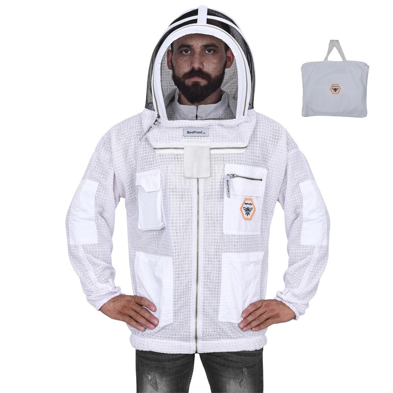 Bee Proof BP-301 Beekeeping Jacket with Veil, 3-Layer Ultra Ventilated Suit for Full Protection, Safety Fencing, YKK Brass Zippers, and Carrying Bag - 3XL (White)