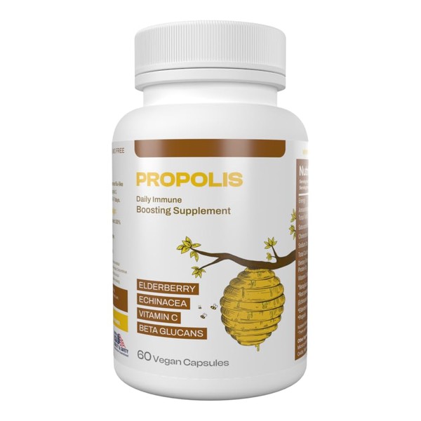 Bee Propolis Immune Support Supplement, Infused with Elderberry, Echinacea, Vitamin C and Beta Glucans, Immune Booster Vitamins and Supplements for Adults, 60 Vegan Bee Propolis Capsules