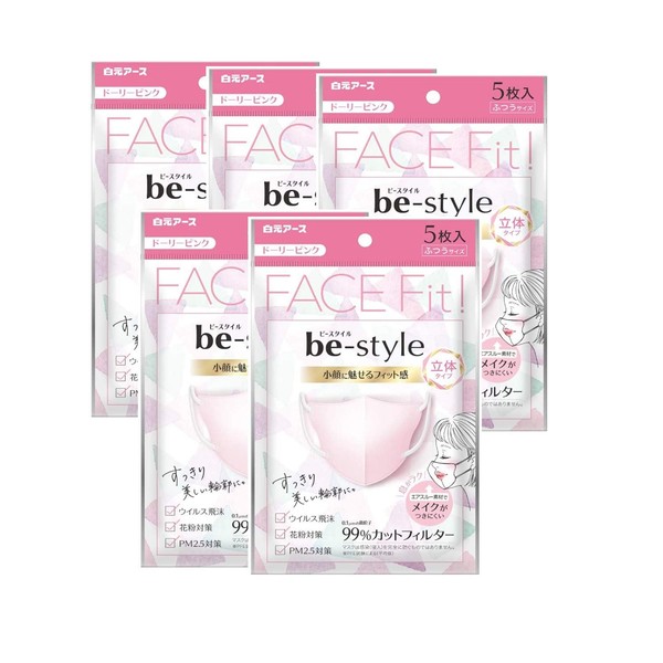 Bee Style Mask, 3D Type, Regular Size, Dolly Pink, Pack of 5 x 5 Bags