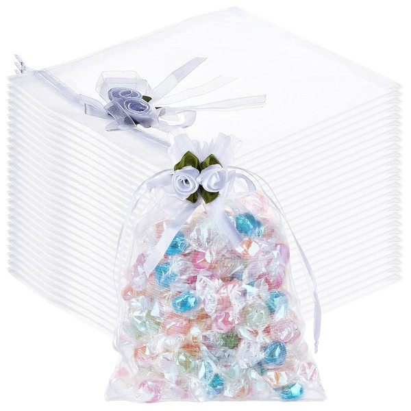 Beebeecraft 40Pcs Organza Gift Bags 5.2x7inch 3D Flower Bow White Wedding Party Favor Drawstring Bags Candy Makeup Jewelry Mesh Pouch Storage for Christmas Wedding Birthday Gifts Packaging Wrapping